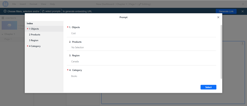 See the following example to generate a link that includes an element prompt, object selector, and PDF export: