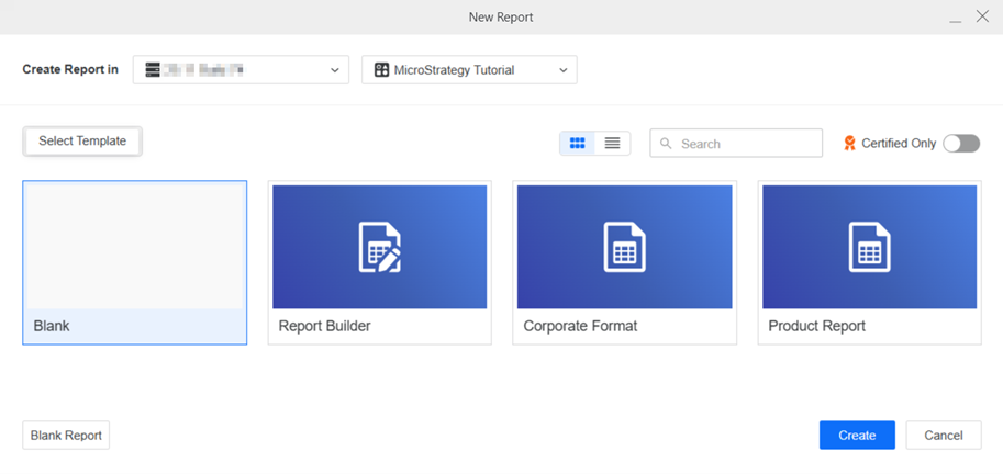 When a project has a default template, you can disable the Blank report template. It no longer displays in the list or as the Blank Report button in the lower left, as shown below.