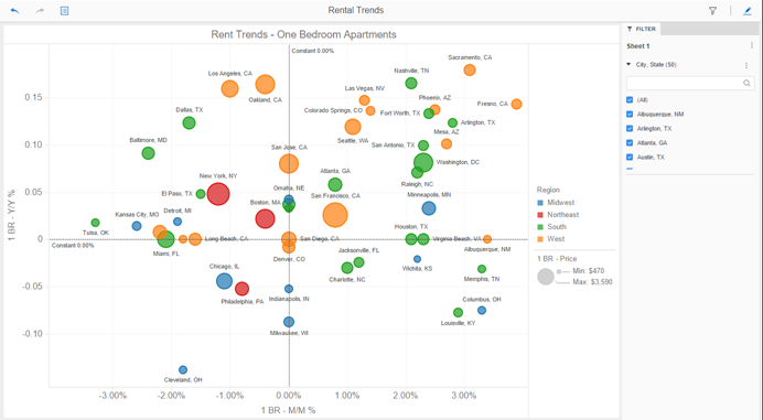 If you created a visualization that filters another visualization, you can use it as a filter. In the example, below, you can select a city in the City Filter visualization, which updates the Rent Trends bubble graphs to display data for only the selected city.