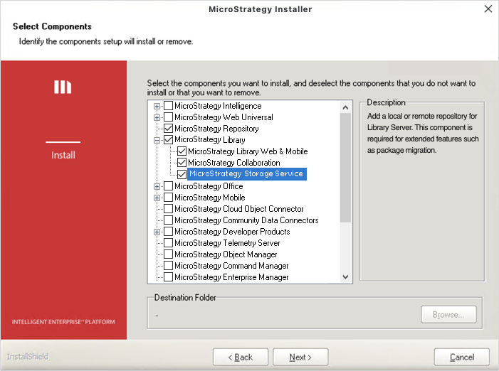 You can configure the Strategy Storage service for the Library cluster using the Strategy Installation wizard in an on-prem environment. One storage service is dedicated to one Library cluster to manage structural and non-structural data. With this service configured, you can use the migration feature to do package migrations across different projects or different environments.