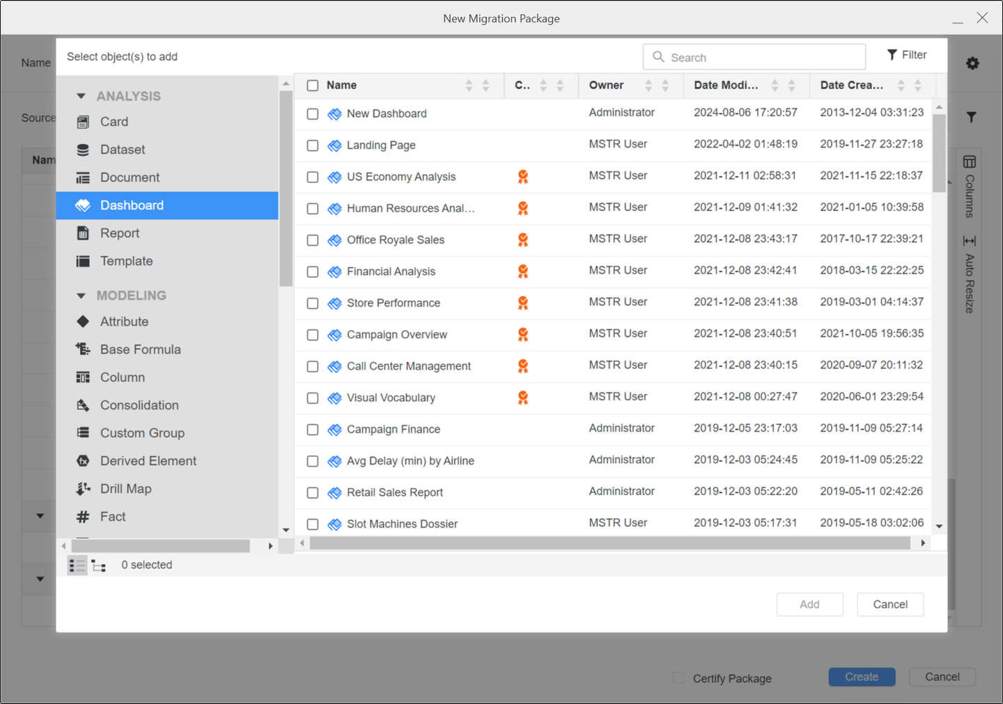Starting in MicroStrategy ONE (September 2024), two new object types (scripts and runtime) have been introduced to the three types of Migration packages (Object, Project, and Administration packages) already available in Workstation.