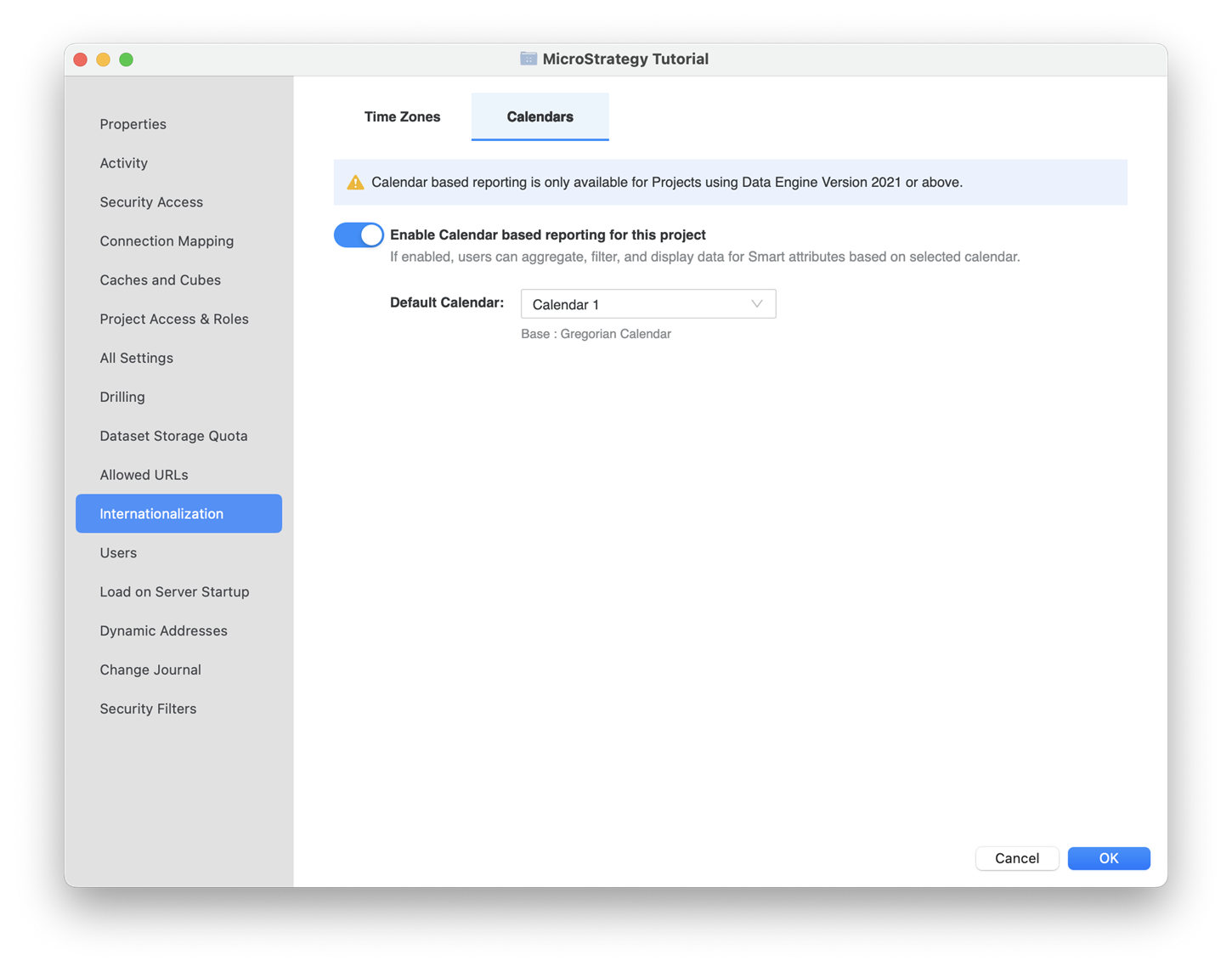 Internationalization objects created prior to MicroStrategy 2021 Update 8 are not compatible and must be recreated. If you previously used time zone based reporting as a preview feature, Strategy recommends deleting all existing objects before upgrading to 2021 Update 8.