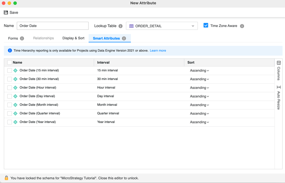 To compliment this feature, we have released a new set of smart attributes. These smart attributes represent different intervals of time and allow you to seamlessly create a complete time hierarchy without the need to create separate attributes for each dimension and maintain relationships between them.