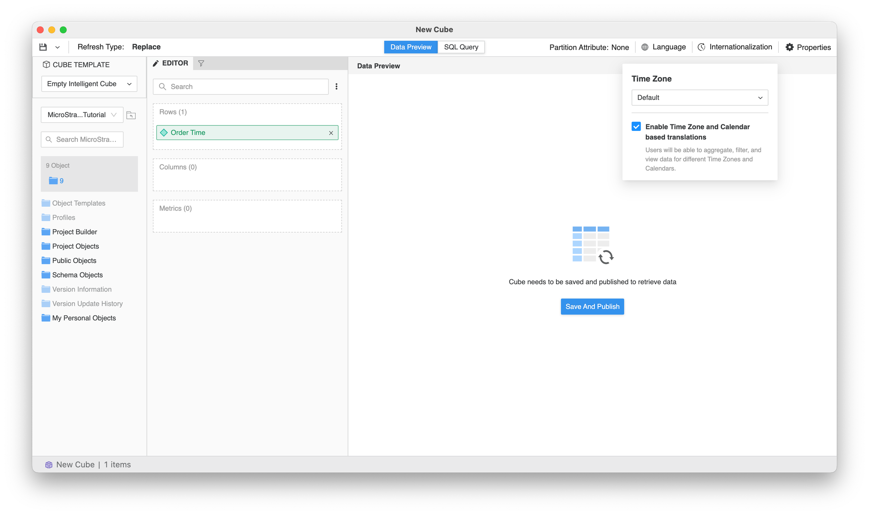 Enable Time Zone and Calendar based translations is selected by default, giving users the option to switch between time zones in objects created on top of the cube. This makes your cube a multiple time zone Intelligent cube. To lock data to a specific time zone and prevent users from switching time zones in objects created on top of the cube, deselect Enable Time Zone and Calendar based translations checkbox. This makes your cube a single time zone Intelligent cube.
