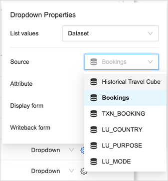 From the DDIC (data driven input control) dropdown list, you can choose any dataset in the dashboard, an attribute from that dataset, and pick display attribute forms and the attribute form to write back.