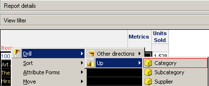 A user can drill up from an attribute to the attribute's parent attribute data, for example, drilling from Item data up to Category data.