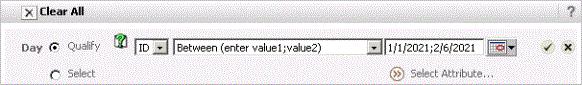 This filter is an attribute form qualification that enables you to filter data based on an attribute with a date data type. For example, you can create a date qualification on the Day attribute to return data for only those days between January 1, 2021, and February 6, 2021.
