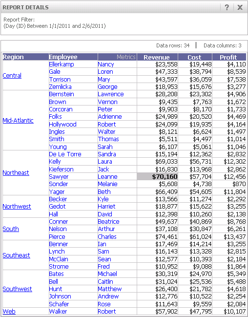 The report displays the revenues of employees for only the specified date range. Notice the new revenue amount for Leanne Sawyer.