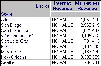 For example, a null value in your data source can occur if a customer omits his birth date or another piece of personal information. If your data source does not contain data in a particular field and you pivot the rows and columns on the resulting report, the resultant cross-tabbing may produce a null value. In the image below, the Internet Revenue column does not have data for display and returns empty cells when the report is run.