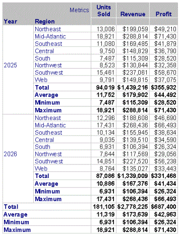 The following image shows the Regional Sales Management report in the Tutorial project with its default report borders, which are pale gray, the same color as the cell borders: