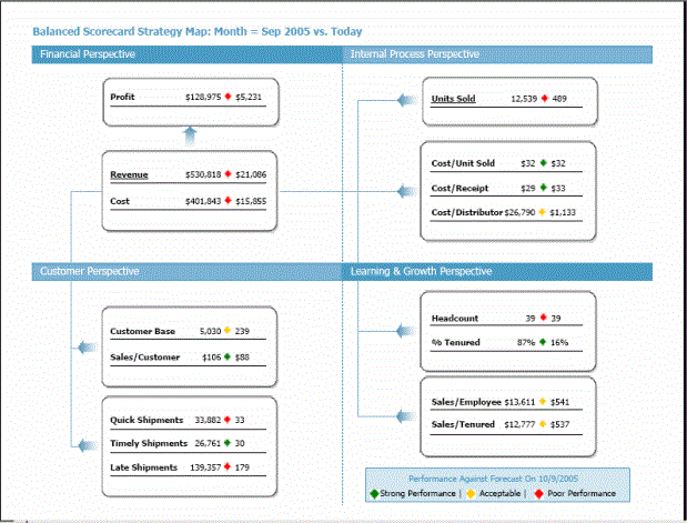 The image above shows the Balanced Scorecard Strategy Map document, a sample document in the MicroStrategy Tutorial project.