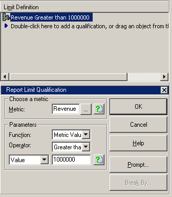 After a report's results are displayed, you may need to further restrict the data displayed without changing how the calculations were performed. You can limit the data displayed in a report by specifying maximum and minimum values for a given metric. These maximums and minimums determine which rows of a result set are displayed in the report, and are called report limits.
