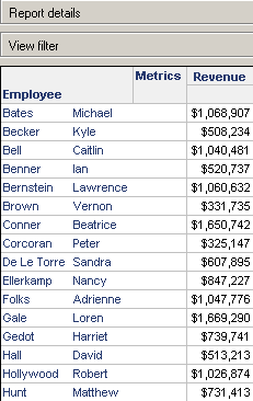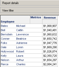 In the example below, the report shows revenue earned by each employee. You want to add a report limit to restrict data to show employees who earned revenue greater than 1,000,000.