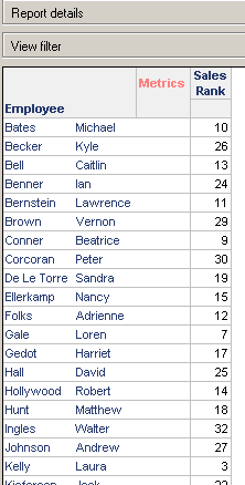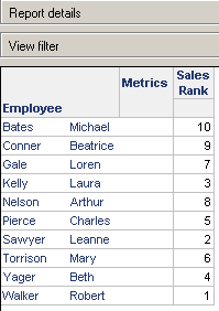 You want to see only the results of the top ten employees. If you apply a report limit to restrict the data displayed to the top ten employees, the data used to calculate the sales rank is not affected. Only the employees displayed changes, as shown in the image below.