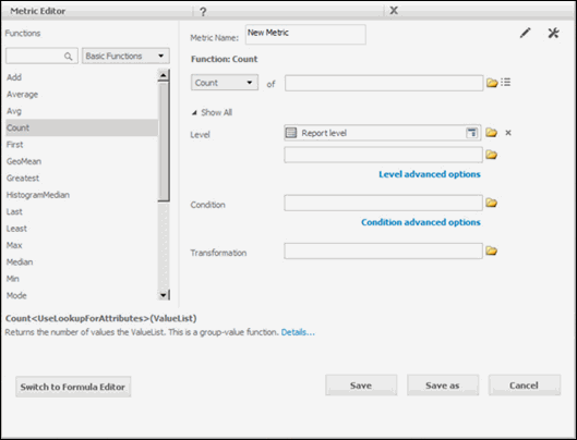 Most metrics open in Function Editor mode in the Metric Editor. Compound metrics and custom metrics open in Formula Editor mode in the Metric Editor. For details on compound and custom metrics in the Formula Editor, click the MicroStrategy Web Help.