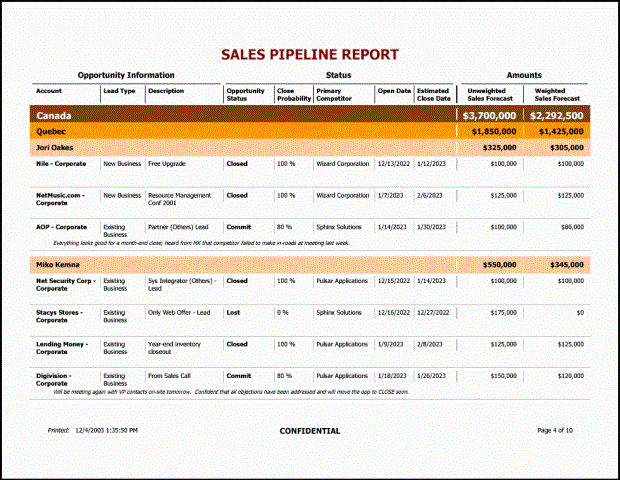 The image above shows a sample production and operational report document. It lists all sales opportunities in the pipeline, and it groups those opportunities based on sales region, sales district, and sales representative. This document also provides a snapshot of each opportunity's current status and measures key metrics such as unweighted and weighted sales forecasts.