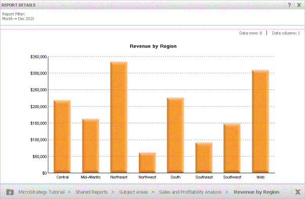 Using the procedure below, you design the report called My Revenue by Region using the Region attribute and the Revenue metric. The report on which it is based can be found in the MicroStrategy Tutorial project in the following location: Shared Reports\Subject Areas\Sales and Profitability Analysis. The report is shown in the image below: