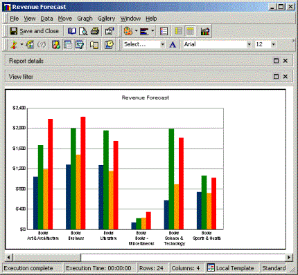 A graph report is a representation of data in a visual format that can help you see overall trends easily, identify medians and exceptions, and so on. You display report data as a graph using Graph view. There are many different graph styles you can choose from to display your report data most effectively. The following figure displays the Graph view of a report in the bar graph style.