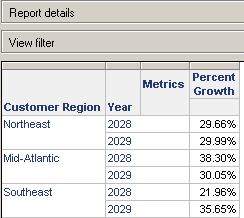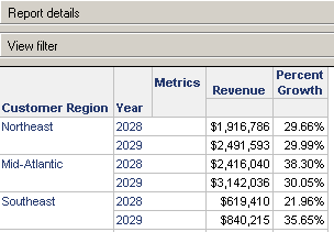 The example image below shows a report with two metric columns, Revenue and Percent Growth.