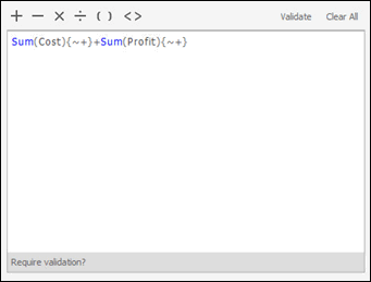 The same metric is shown in the Formula Editor within the Metric Editor in the image below. It is a compound metric because it contains an arithmetic operator (+) that creates a formula out of two existing metrics, Cost and Profit. The level of the metric is indicated between curly braces ({ }) in the metric definition. {~+} denotes that the metric is calculated at the level of the lowest attribute on the report, which is the default calculation level for a metric. Each constituent metric has its own level, and you can change the default level for the individual metrics. No level exists for the entire compound metric as a whole.