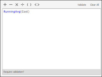 The same metric is shown in the Function Editor within the Metric Editor in the image below. It is a compound metric because it contains a non-group function, Running Average. Because it uses a non-group function, the Function Editor displays the value list and parameters for the function, rather than level, condition, and transformation options. The Cost metric is the input value of the function.