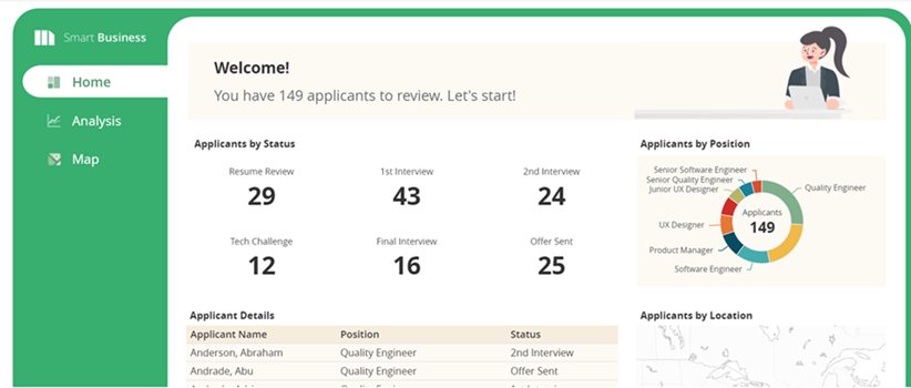 - Create visualizations to display the data in multiple ways, then easily modify, rearrange, or resize the visualizations.