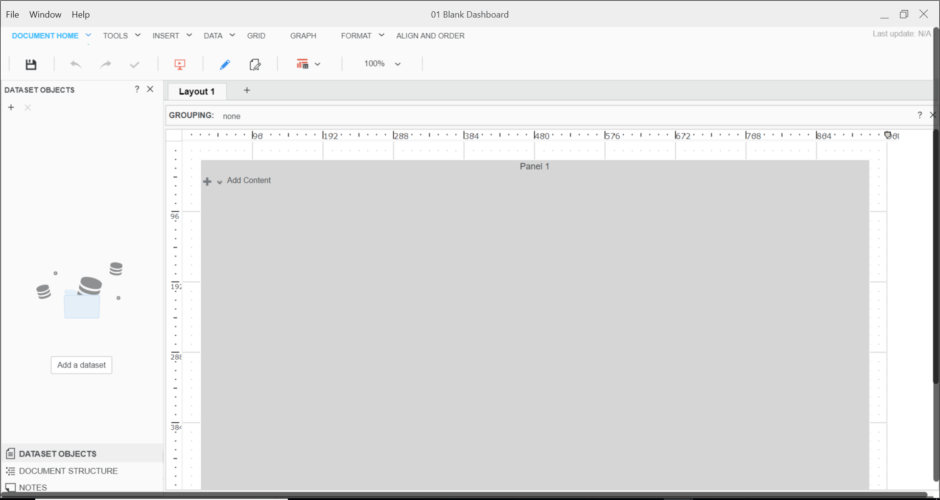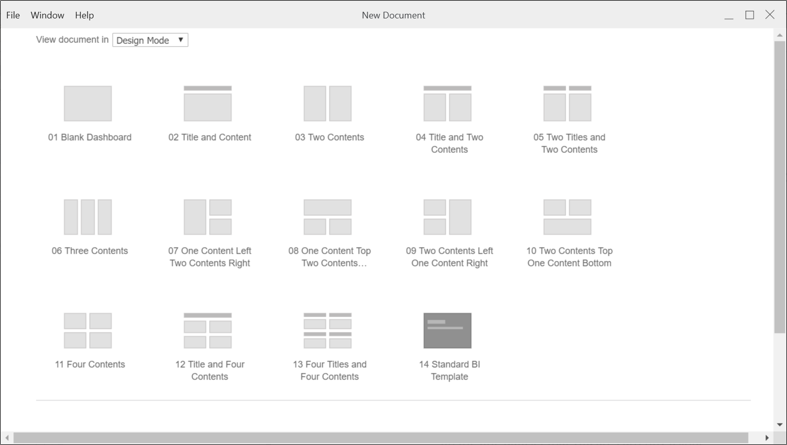 - Seleccione la 01 Tablero en blanco plantilla. Esta plantilla utiliza una sola sección de documento para simplificar el proceso de creación del primer documento. El documento se carga en modo de diseño. El modo de diseño ofrece una amplia gama de opciones de creación de documentos, entre las que se incluyen la adición de objetos de datos y documentos, el formato y el agrupamiento.