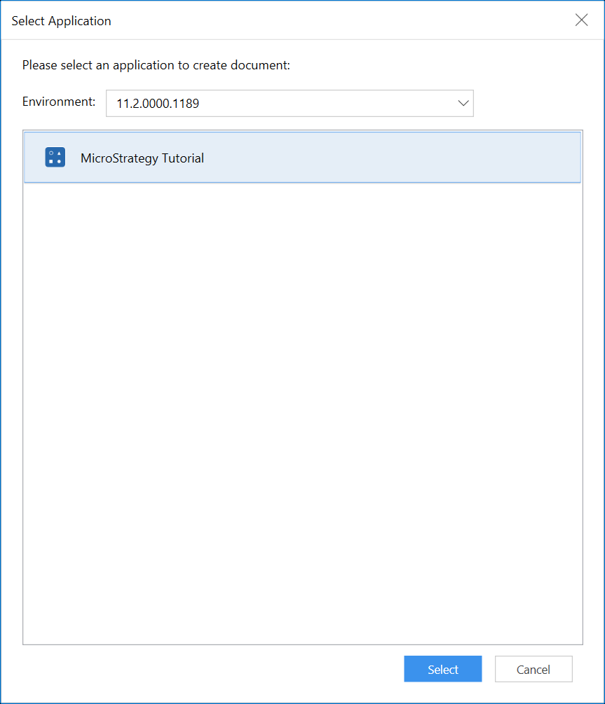 Seleccione la Tutorial de MicroStrategy aplicación y haga clic en Seleccionar.