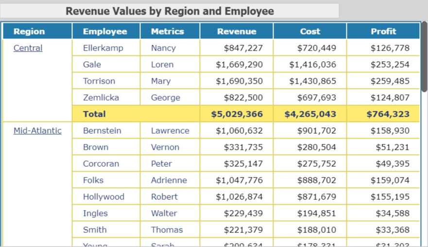 Agregue los totales por región al informe de cuadrícula. Haga clic en la flecha desplegable situada junto a la Empleado encabezado de columna, elija Mostrar totalesseleccione la opción Total y, a continuación, haga clic en Aceptar.