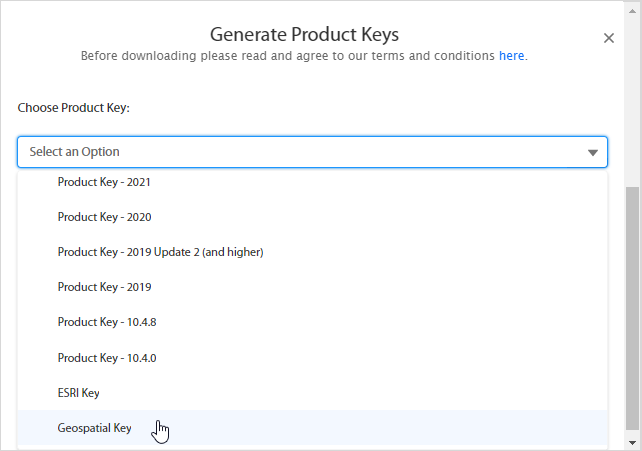 Klicken Sie auf Schlüssel generieren und wählen Sie aus Geospatial Key.
