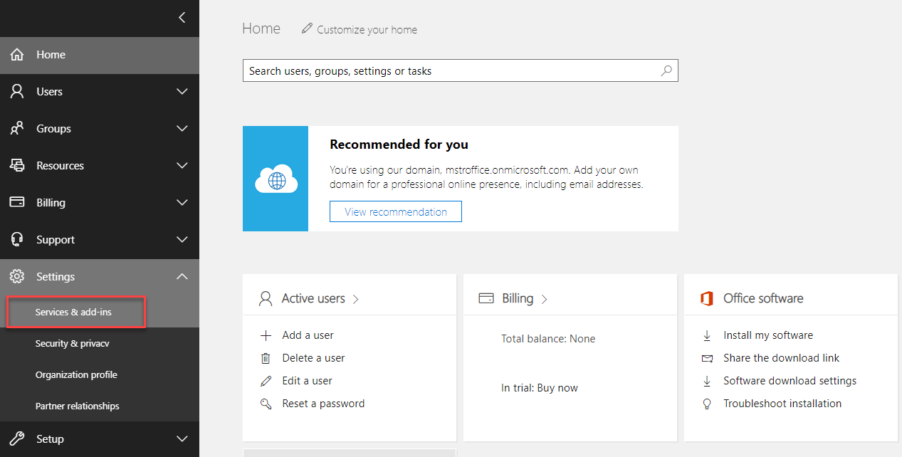 - Microsoft Admin Center で、[設定] > [サービスおよびアドイン] を選択します。