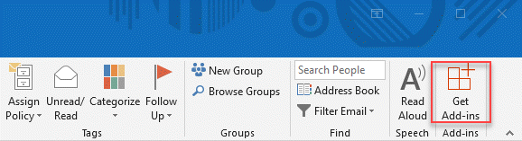 - Outlook Desktop アプリケーションのリボンにある、[アドインを取得] をクリックします。