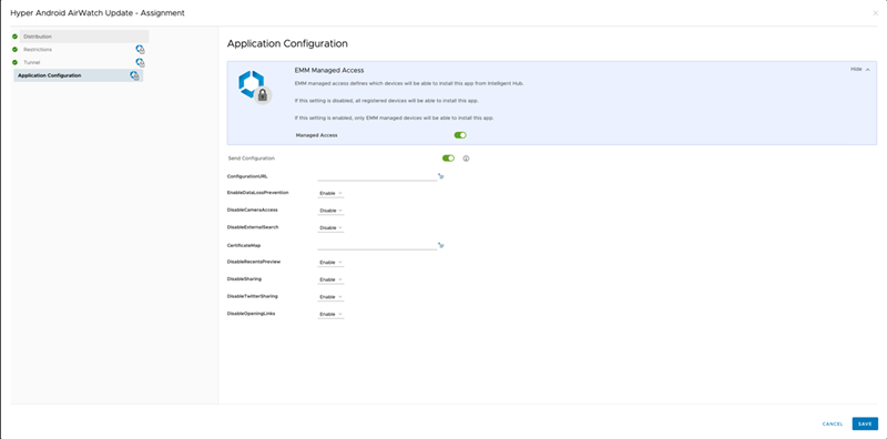 以下のセクションでは、AppConfig 統合を使用して構成を MicroStrategy HyperMobile アプリの構成をプッシュする、アプリ トンネルを構成する、およびセキュリティの制限を構成する方法について説明します。