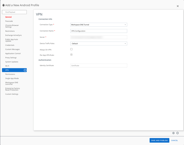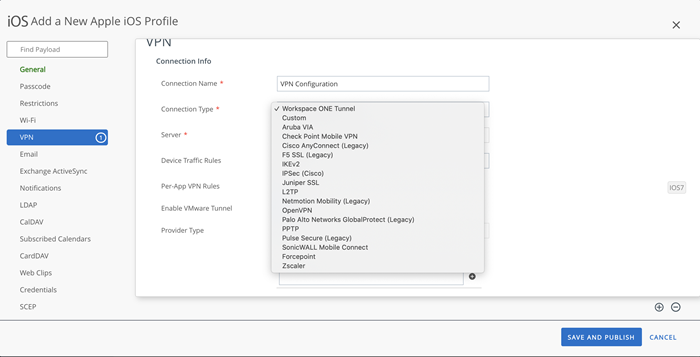 [VPN] > [構成] に移動してデバイス プロファイルに VPN を構成し、[接続タイプ] を目的の VPN に設定します。