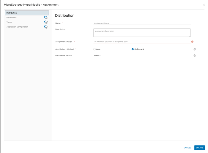 MicroStrategy HyperMobile 用にアプリごとの VPN プロファイルを構成し、アプリごとの VPN プロファイルでデバイス プロファイルを選択すると、VPN の使用が許可されます。[アプリ] > [ネイティブ] で [MicroStrategy HyperMobile] をクリックします。[割り当て] をクリックして割り当てを編集します。