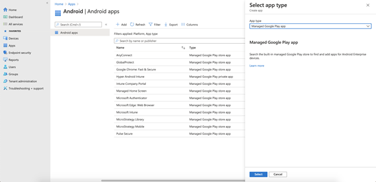 [アプリのタイプ] ドロップダウンの [管理対象の Google Play アプリ] を選択し、[選択] をクリックします。