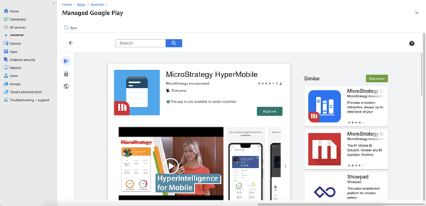 - 左上隅の [同期] ボタンをクリックします。Android アプリのリストに MicroStrategy HyperMobile が表示されます。表示されない場合は、[更新] ボタンをクリックしてアプリのリストを更新します。
