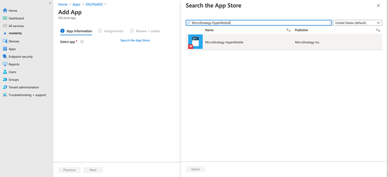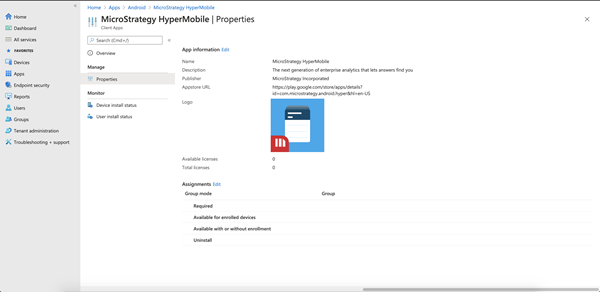 [MicroStrategy HyperMobile] アプリをクリックし、[プロパティ] をクリックします。[割り当て] セクションを探し、[編集] をクリックします。必要なグループとユーザーにアプリを割り当てます。