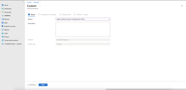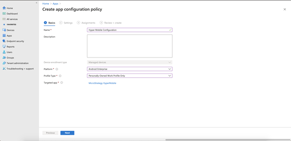 構成に名前を付けます。[プラットフォーム] ドロップダウンの [Android Enterprise] を選択します。[プロファイル タイプ] ドロップダウンでオプションを選択します。対象アプリとして [MicroStrategy HyperMobile] を選択し、[次へ] をクリックします。