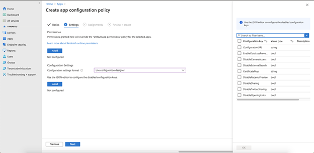 | EnableDataLossPrevention | すべてのアプリの制限に対するメインの切り替え。その他のオプション DisableSharing または DisableCameraAccess、以下の場合にのみ有効です EnableDataLossPrevention は true |