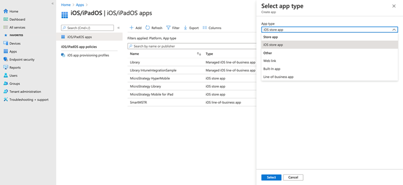 [アプリ] > [iOS/iPadOS] > [+ 追加] に移動し、[アプリのタイプ] ドロップダウンの [iOS ストア アプリ] を選択します。