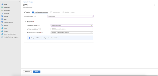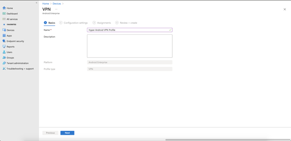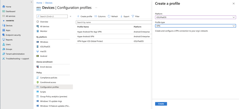 - Microsoft Intune コンソールで、VPN 用の構成プロファイルを作成します。