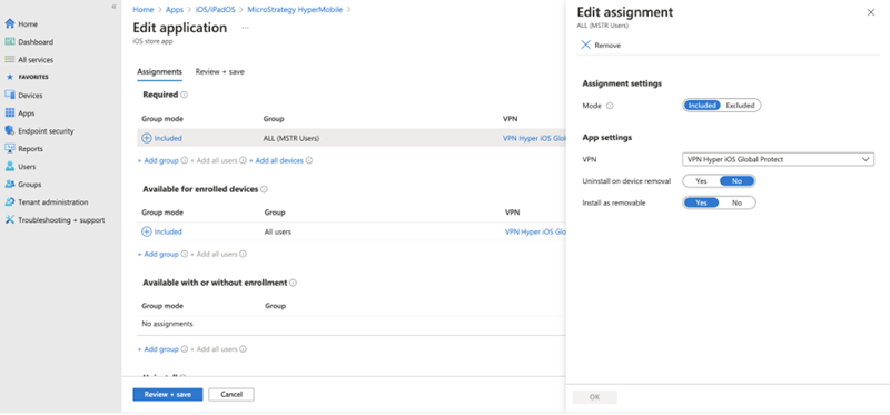 [アプリ] > [iOS/iPadOS] に移動し、MicroStrategy HyperMobile アプリケーションを編集します。手順 2 で作成した VPN プロファイルを選択し、[割り当て] > [アプリ設定] > [VPN] を編集して、変更を保存します。