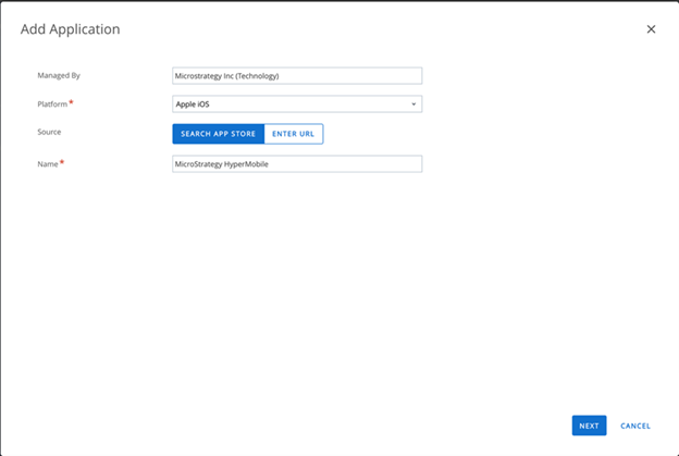 - 手順 1 ~ 4 で作成した [MicroStrategy HyperMobile] アプリを選択し、[次へ] をタップします。