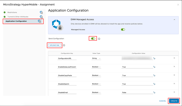 - 最後の画面で [作成] をクリックします。MicroStrategy HyperMobile アプリについて、指定されたグループ、ユーザー、デバイスにアプリの構成が適用されます。