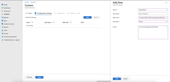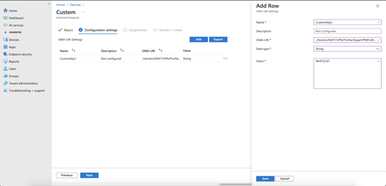 - OMA-URI:Enter ./Vendor/MSFT/VPN/Profile/*Name*/PackageList、ここで Name は上記の接続名です。この例では、文字列は ./Vendor/MSFT/VPN/Profile/HyperVPNProfile/PackageList。