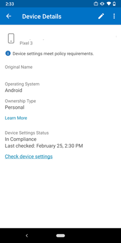 Intune Company Portal アプリを開きます。[デバイス] の下でデバイス名を選択します。[デバイスの設定のチェック] をクリックします。デバイスがサーバーと同期し、VPN プロファイルとカスタム構成ポリシーを取得します。