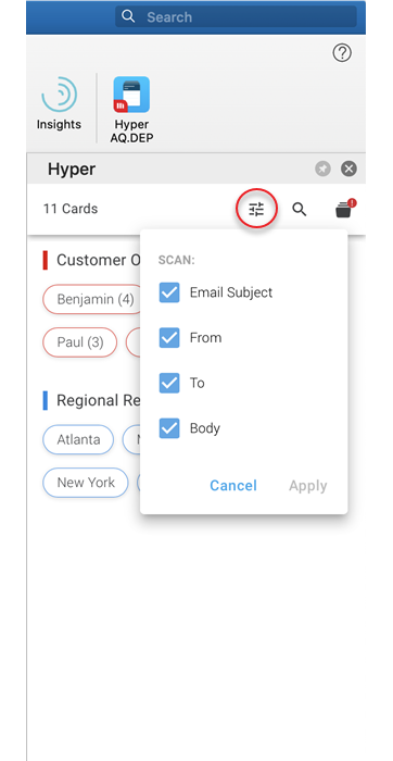 をクリックすると、電子メールのどのオブジェクトがカードをトリガするかをフィルターできます。電子メールの件名、送信元、受信者、電子メール本文の内容から選択します。