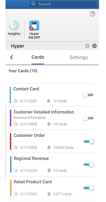 をクリックして [カード] タブを選択すると、環境内にあるカードが表示されます。カードの有効/無効が切り替え可能です。