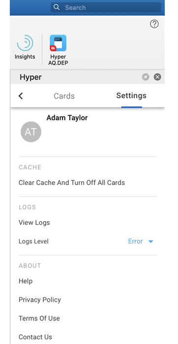 をクリックして [設定] タブを選択すると、キャッシュの消去、ログの表示、ログアウト、および 個人情報管理方針、利用規約、HyperIntelligence for Office ヘルプの表示を行えます。